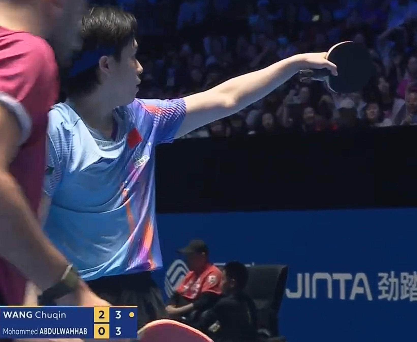 比赛中,王楚钦在发球时被看台上的闪光灯干扰,随后他直接指出赛场不文明行为。